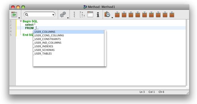 In 4D v12, the new method editor introduces a number of new functions. One of these is the auto-completion function within SQL code. This includes auto-completion of tables and fields within the database, which includes the system tables and their fields.