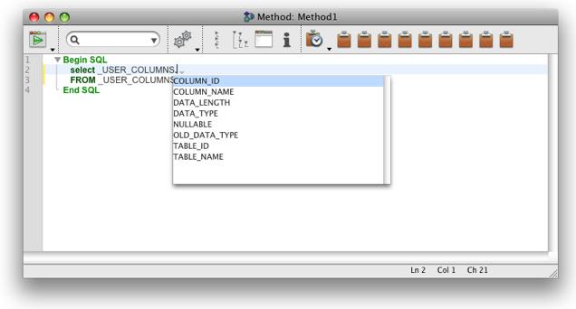 - Bring up all the columns for a table. To do this type the specific system table name followed by a period, and then hit tab, within a Begin SQL/End SQL block. This will bring up the following: