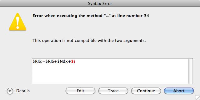 The snippet below will throw up the Syntax Error alert, also shown below, because the local variable $i is undeclared. The error will always come from line 34: