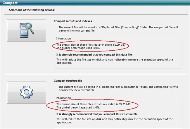 One way a database administrator might decide whether or not it's time to compact a database is by checking the Maintenance and Security Center's Information tab. It's important to note that when you check this tab, it can take a while for the data to populate. Obviously, the length of time depends on the size of your data and structure files. Take a look at the two examples below: