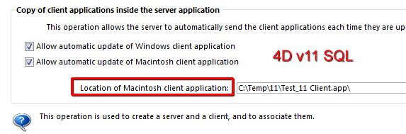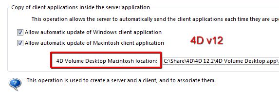 The procedure for building update clients for the opposite platform has changed in 4D v12. Reminder: an "update client" is a copy of the client that is used in the automatic update mechanism for clients via the network. With this feature a server can be deployed that includes an update client for both Mac OS X and Windows.