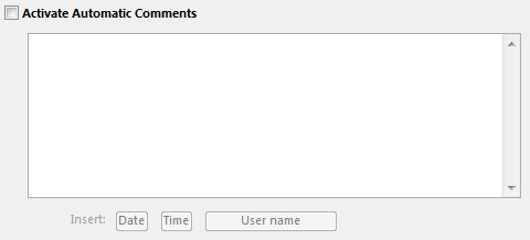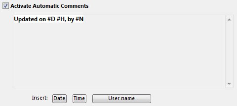 One the Activate Automatic Comments checkbox is checked, the text area below can be edited. Notice that there are 3 insert options: Date (#D), Time (#H) and User name (#U). They can be used in conjunction with static text. Here is an example:
