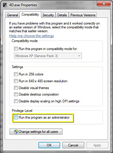 PLEASE NOTE: elevating the privileges of 4D will cause a UAC prompt to be displayed every time 4D is launched.