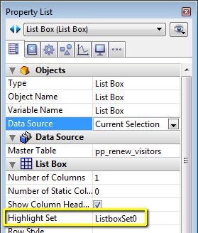Important Note: the set that is bound to a List Box with a selection data source is a process set by default. This can be changed to a local or interprocess set by modifying the set name: