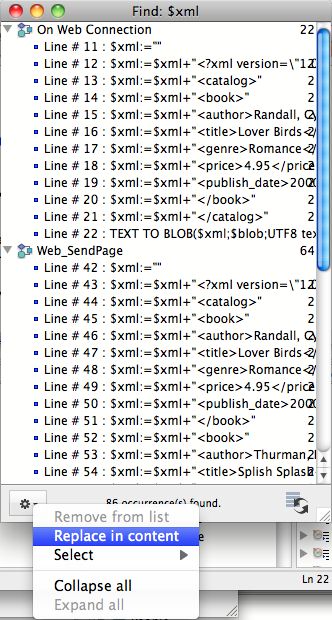 The Find and Replace in the edit menu is a great tool; however it only works for one method window. To replace all instances of a phrase in a database use the Find In Design to search for the phrase you wish to replace. Click the gear in the lower left corner and select replace to replace all instances of the phrase with a new phrase.