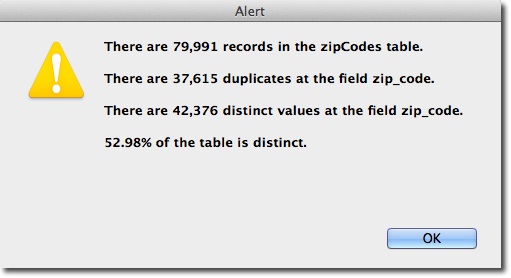 The included utility method DistinctsAndDuplicates, listed at the bottom of this Tech Tip, will produce the alert shown above with statistics shown. It is pure 4D SQL and provides one example of how to use the SQL DISTINCT clause/keyword in conjuction with the SQL COUNT function.