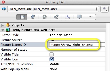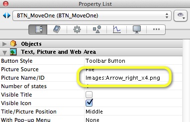 When working form objects such as 3D Buttons and Picture Buttons, the images can be located in the picture library or in the Resources folder located next to the database structure file. When using the option to store the images in the Resources folder care must be taken to make sure the images will be visible on both Macs and Windows.