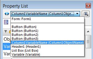 When the Property List for the form is displayed, select the drop down menu at the top of the property list to get a list of all the objects. The form objects are listed in the following format: