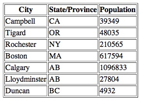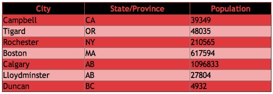 | <table> <th>City</th><th>State/Province</th><th>Population</th> <tr><td>Campbell</td><td>CA</td><td>39349</td></tr> <tr class="alt"><td>Tigard</td><td>OR</td><td>48035</td></tr> <tr><td>Rochester</td><td>NY</td><td>210565</td></tr> <tr class"alt"><td>Boston</td><td>MA</td><td>617594</td></tr> <tr><td>Calgary</td><td>AB</td><td>1096833</td></tr> <tr class="alt"><td>Lloydminster</td><td>AB</td><td>27804</td></tr> <tr><td>Duncan</td><td>BC</td><td>4932</td></tr> </table> |