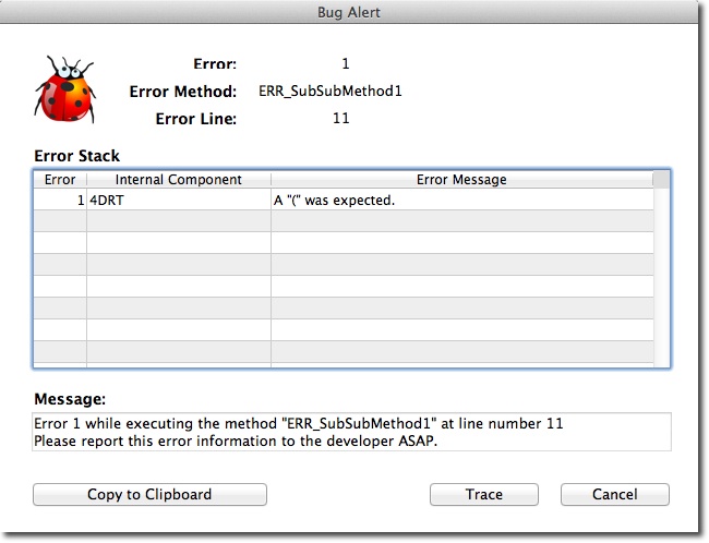 | C_LONGINT(Error_L;ErrorLine_L) C_TEXT(ErrorMethod_T;Msg_T) // Copy the 4D system variables in the dialog variables // ( ErrorCode_L:=Error ErrorMethod_T:=Error method ErrorLine_L:=Error Line // ) ARRAY LONGINT(Codes_aL;0) ARRAY TEXT(IntComp_aT;0) ARRAY TEXT(Text_aT;0) GET LAST ERROR STACK(Codes_aL;IntComp_aT;Text_aT) Msg_T:="Error "+String(ErrorCode_L)+" while executing the method \""+\ ErrorMethod_T+"\" at line number "+String(ErrorLine_L) Msg_T:=Msg_T+"\rPlease report this error information to the developer ASAP." // Display the error dialog // ( DebugAlert // ) |