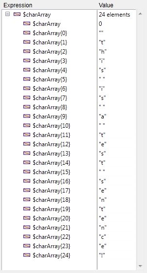 The above code will populate the array $charArray as shown: