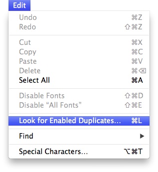 2) From the Edit menu select "Look for Enabled Duplicates..." (see image below).