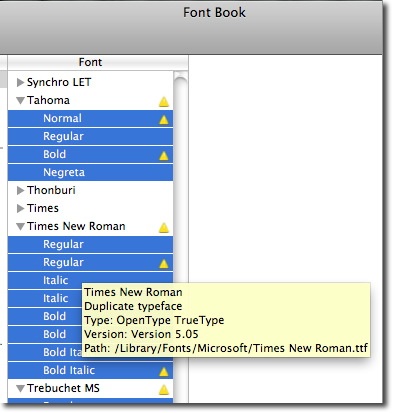 3) The duplicated fonts will be marked with the warning triangle. Hovering over a font brings up a font detail tip.