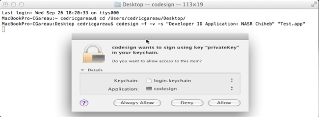 sudo chmod 755 AppName.app/Contents/MacOS/AppName codesign -f -v -s "Mac Developer: FirstName LastName" "AppName.app"