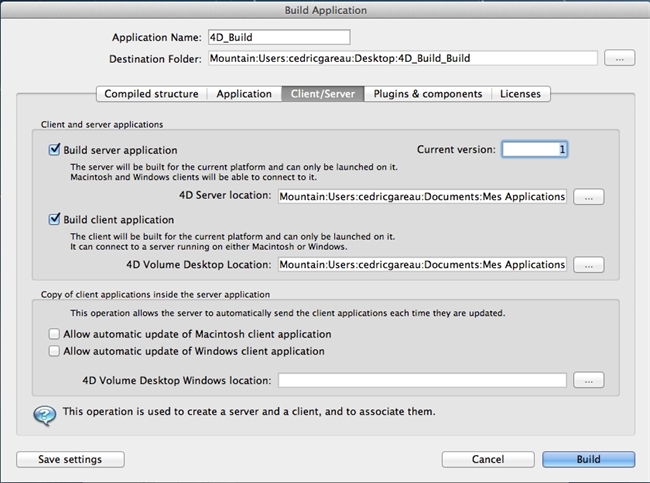 - Client / Server: go to the "Client / Server" tab and specify the location of the 4D Server and 4D Volume Desktop: