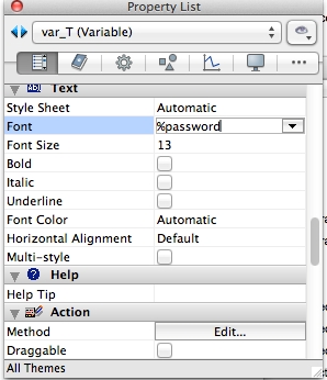 However, there is a second way. In the Property List you can set the font under the Text section. The font %password does not show up in the drop down menu but it can be typed in manually.