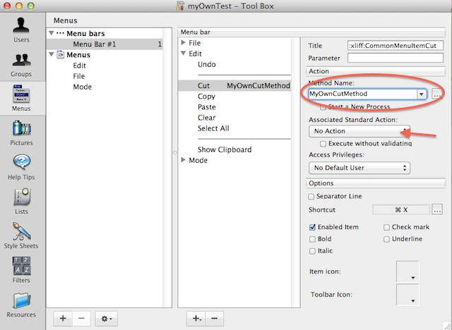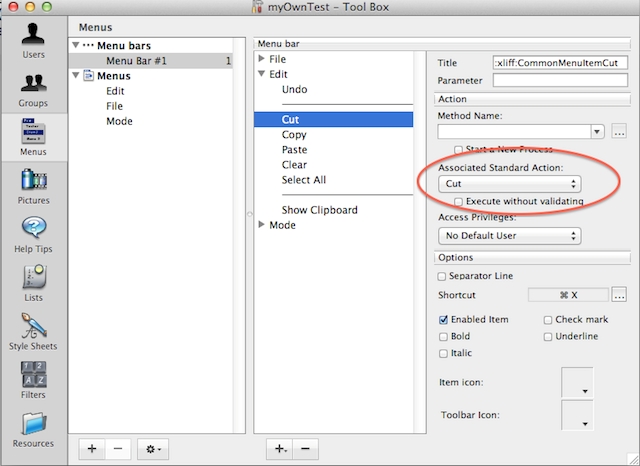 The default Edit menu provides the standard set of menu items such as Undo, Cut, Copy, Paste and Clear. These menu items have a standard action associated with it. It means that the action can only be applied to an enterable object such as variables and field. For an object such as List Box, these standard actions have no effect. A custom action can be implemented in a project method and associated to each menu item instead of the standard action.