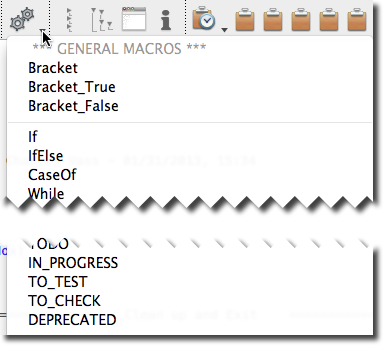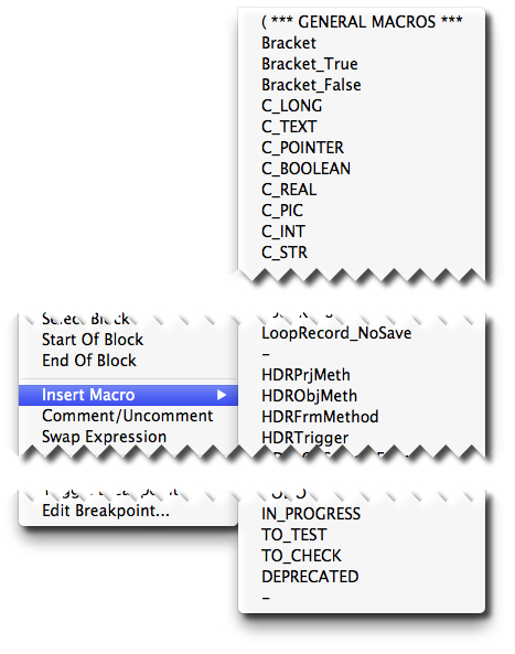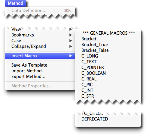 When constructing 4D Macros, there are seven attributes to the Macro tag; name, type_ahead, type_ahead_text, method_event, version, in_menu and in_toolbar. The last two attributes in_menu and in_toolbar affect how 4D macros are accessed using the mouse.