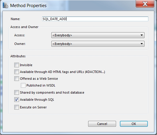 First create a method in 4D, in this example we saved the method as SQL_DATE_ADD, then set the method property for 'Available through SQL' to true: