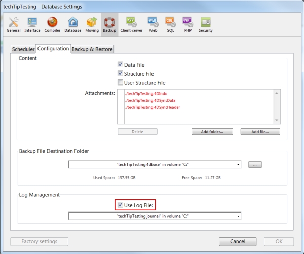 The journal/log option needs to enabled on the operational database, but should be disabled on the mirror database. Failure to disable the log/journal on the mirror may cause issues.