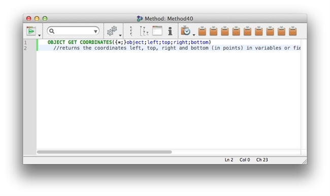 By default, all the above settings are checked. So, when a command is dragged and dropped into a method editor the command is entered with the appropriate syntax along with comments describing the 4D command as shown: