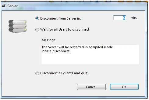 Note: Switching between the modes from the Run menu in a 4D client when connected to a 4D server displays a window with the message “The server will be restarted in the compiled or interpreted mode” depending on the mode chosen. Disconnecting from the server will switch between the two modes.