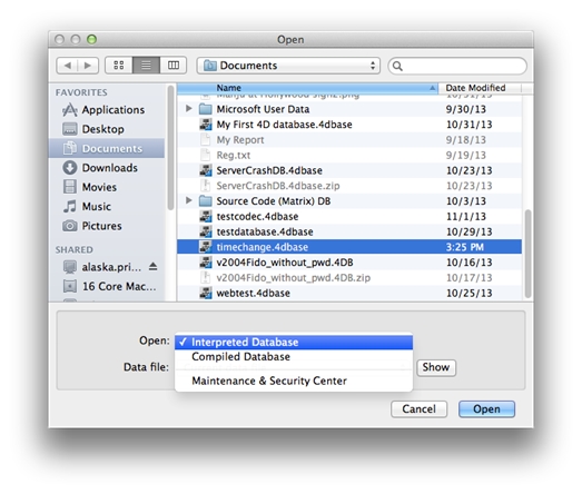 On Mac it is available on open dialog when the user opens the database in 4D and clicks on the up and down arrows and chooses one of the options interpreted database or compiled database.