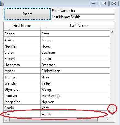 From the picture below, assume when you insert the name "Joe Smith" to the end of the listbox, you want to display the inserted row. Notice the scroll is at the top of the listbox.