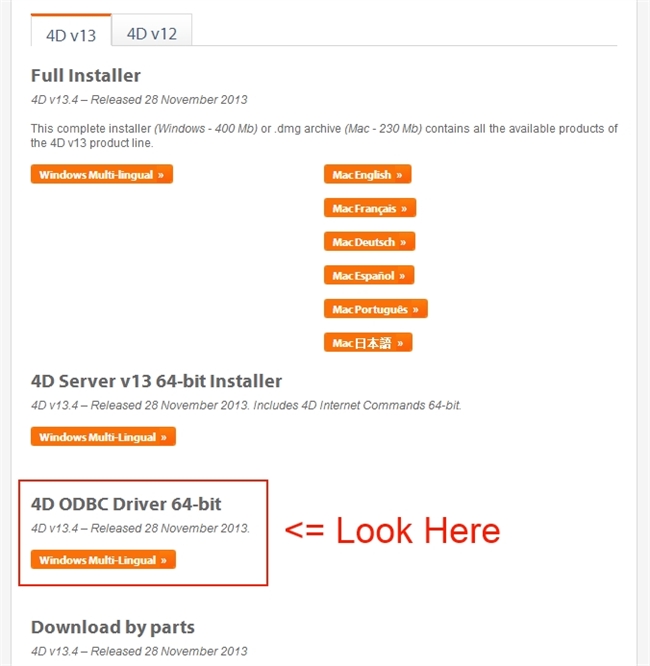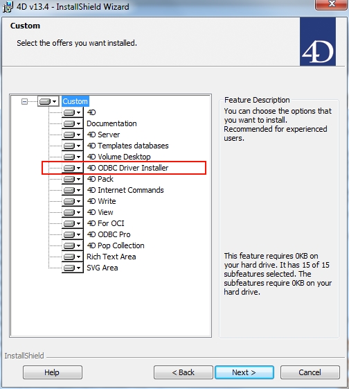 Once the custom installation of 4D is complete, the '4D ODBC Driver' will not be installed, however installer for the '4D ODBC Driver' will be at the location specified by the installer. If using the default install location on a 64 bit version of Windows, the v13.4 Driver will be located at: