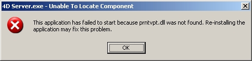 On Windows, 4D v13 uses the Microsoft XPS Print Driver for certain tasks such as print preview. Therefore the XPS print driver must be installed on the machine running 4D or 4D Server. If the XPS print driver is not installed on the machine running 4D or 4D Server an error may be presented upon launching the application regarding missing components or files such as PRNTVPT.DLL