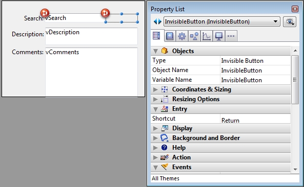 This will enable the invisible button when the focus is on the first text field, and disable it when it loses the focus. A final step is to make sure that vSearch has the events On Getting Focus and On Losing Focus checked in the properties list.