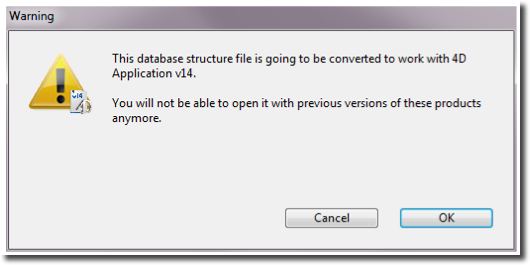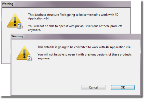 When upgrading a 4D database from one version to another (e.g., v11 to v12, v12 to v13), two warning dialogs will be presented to the user. The first warning is for the structure file conversion and the second warning is for the data file conversion.