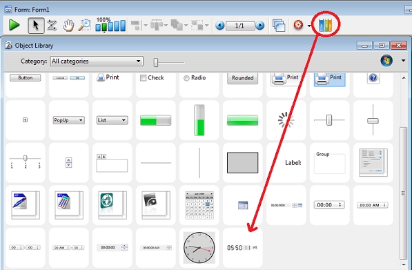 The TimePicker LCD widget is placed on a page 1 (or another other page except 0) where it would need to be aligned with the object on the background. Picture below shows the location to access the widget in red below: