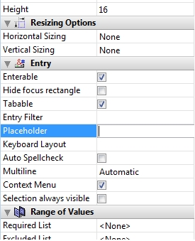 To create a placeholder for an object there is a new property in some of the objects' Property List called Placeholder as shown below. Anything typed in the field will be shown in the object if it is empty. This only applies to objects that will visually display a placeholder.