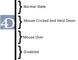 The picture file will be a 4:1 height to width ratio where each 1:1 portion from top to bottom represents four different states of the button: (Normal, Clicked and mouse held down on, mouse over, and disabled in that order). By leaving three of the sections representing states blank and having the section of the image the represents the click on and held state be a transparent image this will create a generic highlight button that can be used similarly to the old highlight button.