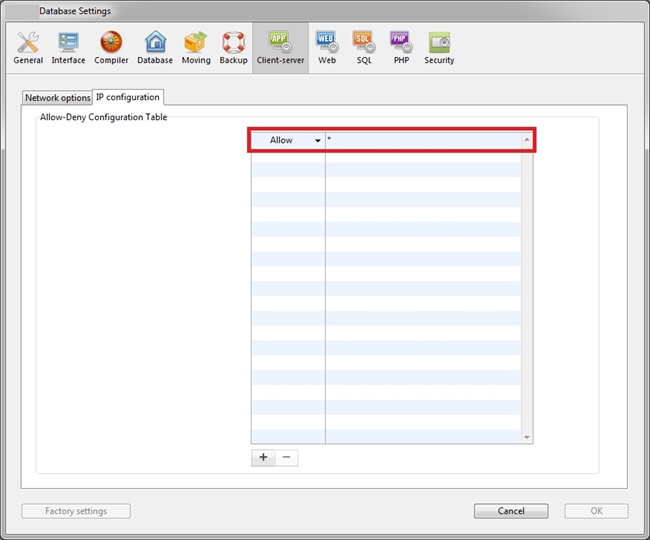 Keep in mind that the IP addresses that are denied will still see the Server in the connections dialog (given the server is running on the default port of 19813). Denied IP addresses however will not be able to connect to the database.