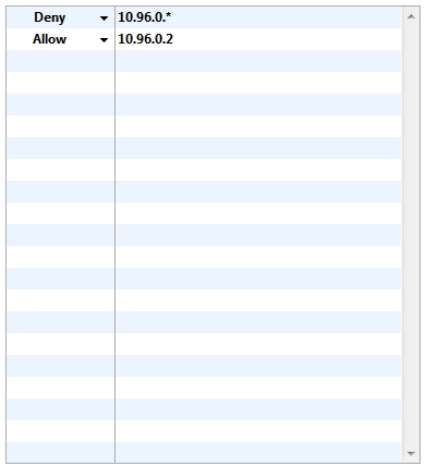In contrast, rules that allow certain IP addresses prior to them being denied will be taken into acount. The table below will allow the address 10.96.0.2 to connect to the server.
