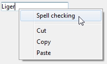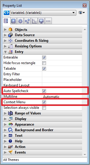 The 'Auto Spell' check property must be set for the spell check related choices to appear on the context menu. Then the spell check related options can be displayed by setting it through the context menu when contextually clicking the an object with the setting set as shown below.