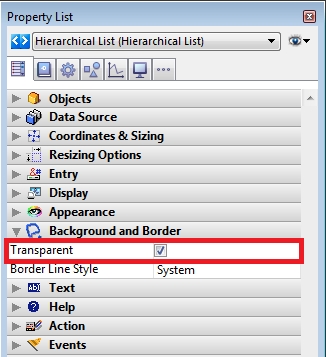 Not only can a transparency effect work on fields, variables, listboxes, and buttons but it can also work with a Hierarchical List. The transparent option is located in the property list of an object shown below: