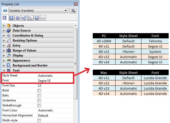 When placing objects in a form, the default Style Sheet setting in the Property List have changed in versions of 4D. The difficulty of changing the Style Sheet for an object with a setting for example "None" will be done manually.