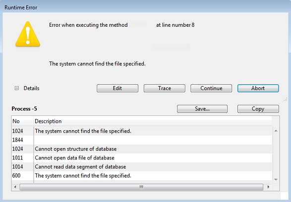 If the structure file is not found when trying to use the commands (USE DATABASE DATAFILE or USE REMOTE DATABASE DATAFILE) in SQL, it will display a runtime error as the following:
