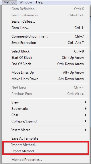 - Imported methods are inserted to where cursor is at on the method editor. If any code is highlighted, they will be overwritten.