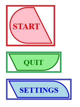 //Generate SVG Document $svgRef:=SVG_New //Creates Start Button $objRef1:=SVG_New_arc ($svgRef;100;100;60;180;360;"red";"pink") SVG_PATH_MOVE_TO ($objRef1;100;160) SVG_PATH_LINE_TO ($objRef1;180;160) SVG_PATH_LINE_TO ($objRef1;120;40) SVG_PATH_LINE_TO ($objRef1;100;40) SVG_SET_ATTRIBUTES ($objRef1;"style";"fill:pink; stroke:red; stroke-width:3") SVG_SET_ID ($objRef1;"START") $objRef1text:=SVG_New_text ($svgRef;("START");95;85;"helvetica";28;Bold;Align center;"Red") //Creates Settings Button $objRef2:=SVG_New_arc ($svgRef;275;95;55;0;90;"blue";"lightblue") SVG_PATH_MOVE_TO ($objRef2;275;40) SVG_PATH_LINE_TO ($objRef2;130;40) SVG_PATH_LINE_TO ($objRef2;158;95) SVG_PATH_LINE_TO ($objRef2;330;95) SVG_SET_ATTRIBUTES ($objRef2;"style";"fill:lightblue; stroke:blue; stroke-width:3") SVG_SET_ID ($objRef2;"SETTINGS") $objRef2text:=SVG_New_text ($svgRef;"SETTINGS";230;53;"helvetica";26;Bold;Align center;"Blue") //Creates Quit Button $objRef3:=SVG_New_arc ($svgRef;275;105;55;90;180;"green";"lightgreen") SVG_PATH_MOVE_TO ($objRef3;275;160) SVG_PATH_LINE_TO ($objRef3;190;160) SVG_PATH_LINE_TO ($objRef3;163;105) SVG_PATH_LINE_TO ($objRef3;330;105) SVG_SET_ATTRIBUTES ($objRef3;"style";"fill:lightgreen; stroke:green; stroke-width:3") SVG_SET_ID ($objRef3;"QUIT") $objRef3text:=SVG_New_text ($svgRef;"QUIT";245;116;"helvetica";26;Bold;Align center;"Green") //Sets the SVG document as the picture object SVG EXPORT TO PICTURE($svgRef;pictureObject;Copy XML data source) |