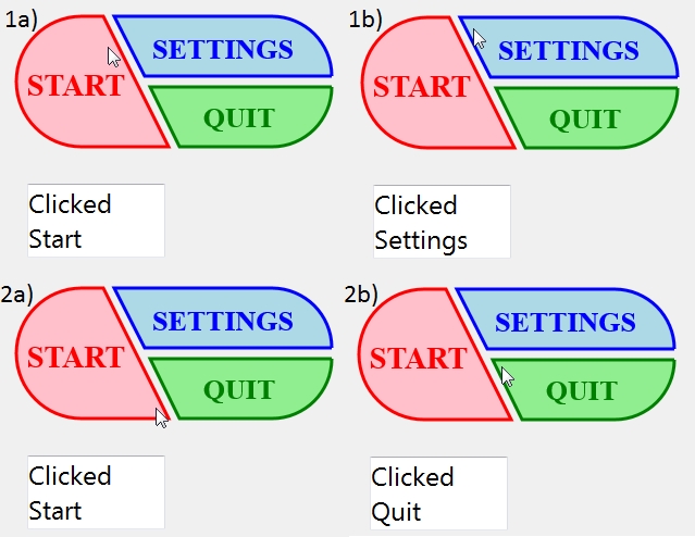 With this method there will be no overlap and clicking the uniquely shaped button as represented by the image will return the correct output as shown below in the 4 cases: