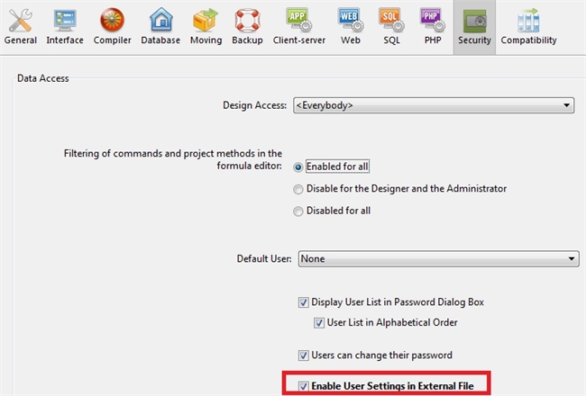 4D has a User settings feature that provides a Structure settings window with less access so that users can have the freedom of modifying the settings to optimize their setup. To activate this feature it must first be set in the Database Settings under the Security Tab as shown below.