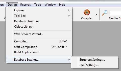 In design mode the Menu Bar >Design > Database Settings... item will become a submenu containing two items: Structure settings and User Settings.
