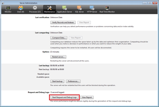 Note: In a client/server setup, the location the logging is started matters. If the logging is started on the server, the logs will only capture events that occur on the server, visa versa for client. This means that if the debug logging is started through the server administration window on a client, the logging will occur on the server. On the other hand, if the logging is started programatically using SET DATABASE PARAMETER on the client, the logging will occur on the client. Likewise, if SET DATABASE PARAMETER is ran on the server, the logging will occur on the server.