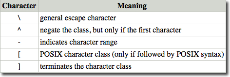 How metacharacters are treated depends on they are inside or outside a character class. A character class is defined by square brackest, [ ].
