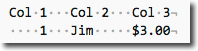 For example say the requirement is to create a column display but Tab characters are not supported. To create the column effect headers and variables will have to be padded on the left and right to create the format. In the image below the gray dots represent space characters. In this example the columns are five characters wide separated by three spaces. Numbers to be right justified, left padded, with text to be left justified, right padded.