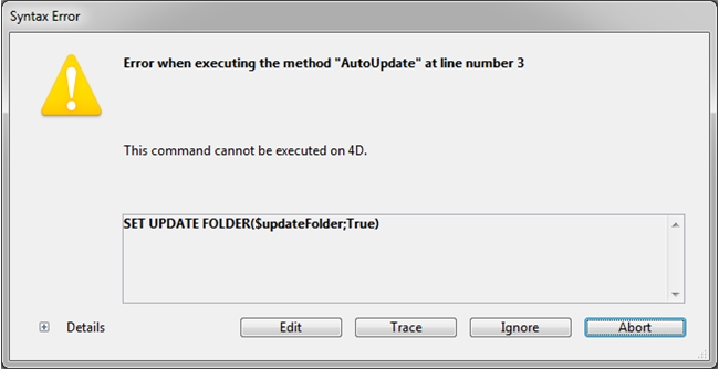 SET UPDATE FOLDER can be used to prepare an application for an automatic update. SET UPDATE FOLDER can be used in the context of a built client/server application and a built stand alone application. The command will only run under these environments and will return the following error if executed in interpreted mode: